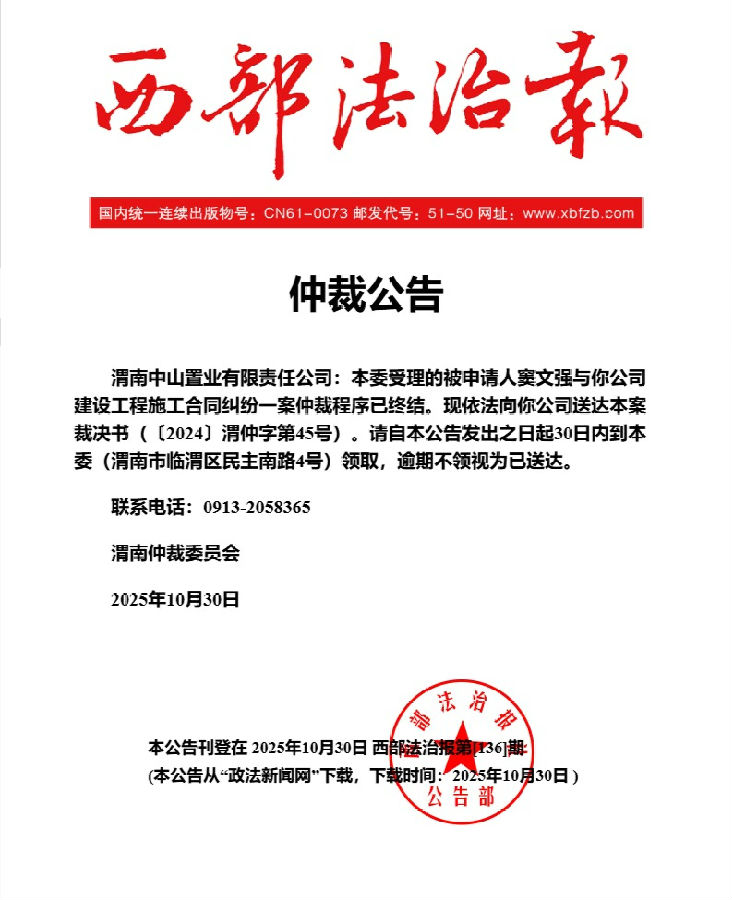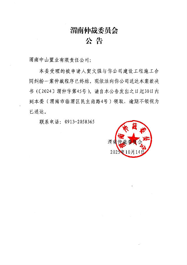 渭南中山置業(yè)有限責(zé)任公司與竇文強建設(shè)工程施工合同糾紛案公告